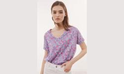 - Forme T - Motif fleuri devant et dos uni - Col V - Manches courtes - Fentes d'aisance aux côtés - Col V avec finition bord-côte contrasté - Manches courtes à revers - Tee-shirt asymétrique avec dos plus long